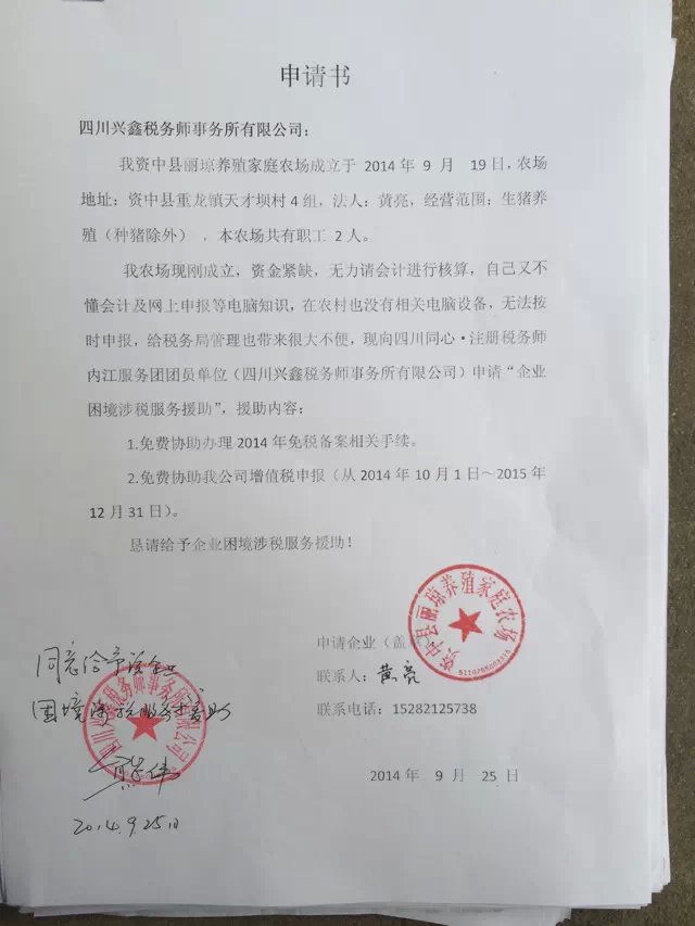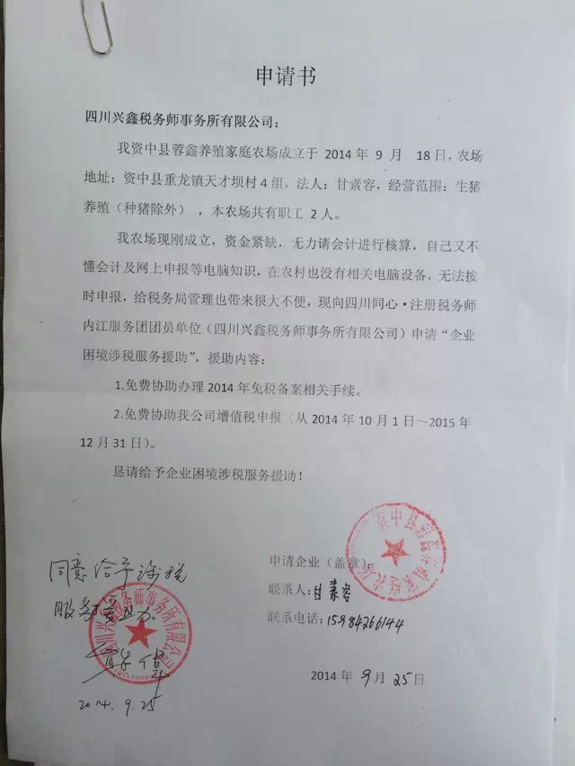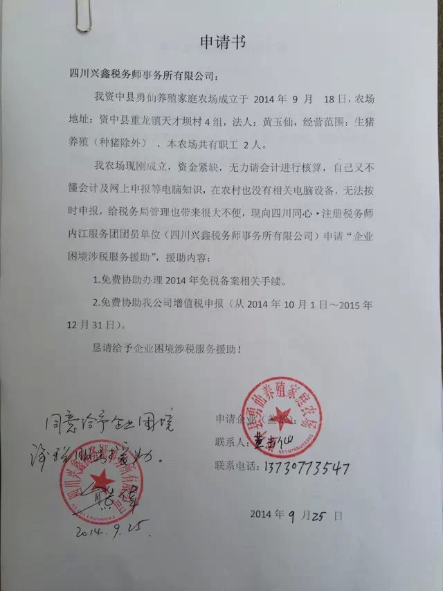 為托起困境企業(yè)騰飛的翅膀,為解決當(dāng)?shù)囟悇?wù)分局征管上的難題,四川同心·注冊稅務(wù)師服務(wù)團(tuán)團(tuán)員單位(四川興鑫稅務(wù)師事務(wù)所有限公司)愿為這些請不起會計、又無力自行申報的農(nóng)庭農(nóng)場進(jìn)行涉稅服務(wù)免費援助。目前共20戶家庭農(nóng)場申請了困境企業(yè)涉稅服務(wù)免費扶助(詳見后附申請書)